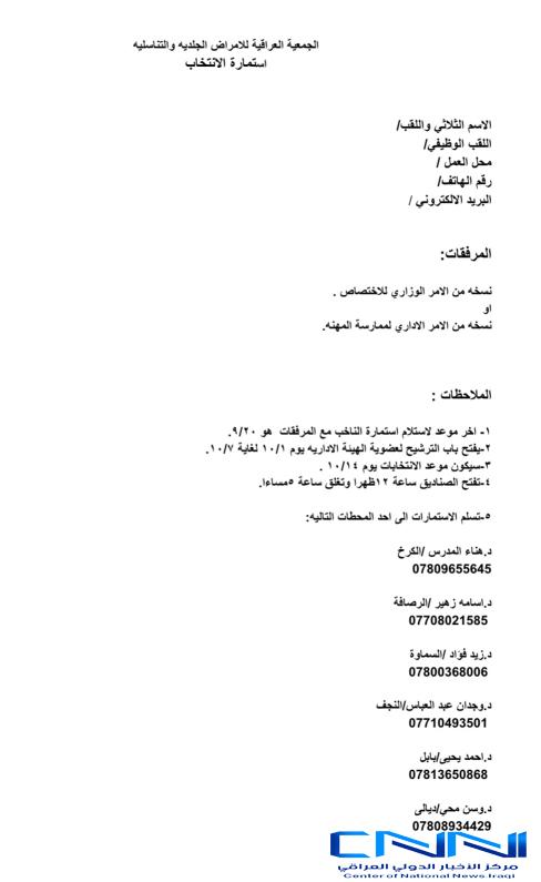 تعلن الهيئه التأسيسيه لجمعيه اطباء الجلديه في العراق عن موعد الانتخابات والترشيح وتطرح استمارة الناخب لاطباء الجلديه في العراق