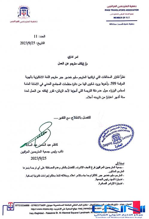 اصدرت جمعية المترجمين العراقيين امر اداري بايقاف عمل المترجم(سليم خضير جبر) لمدة ستة اشهر نتيجة الاخطاء المتكررة وكثرة الشكوى .